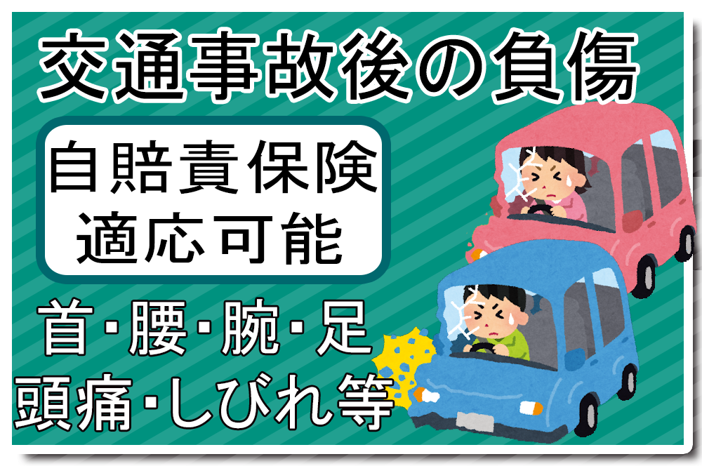 交通事故(自賠責保険)による怪我は自己負担なしで治療を受けられます。土日祝日だけでなく、時間外での施術も予約できるので、まずはご連絡ください。